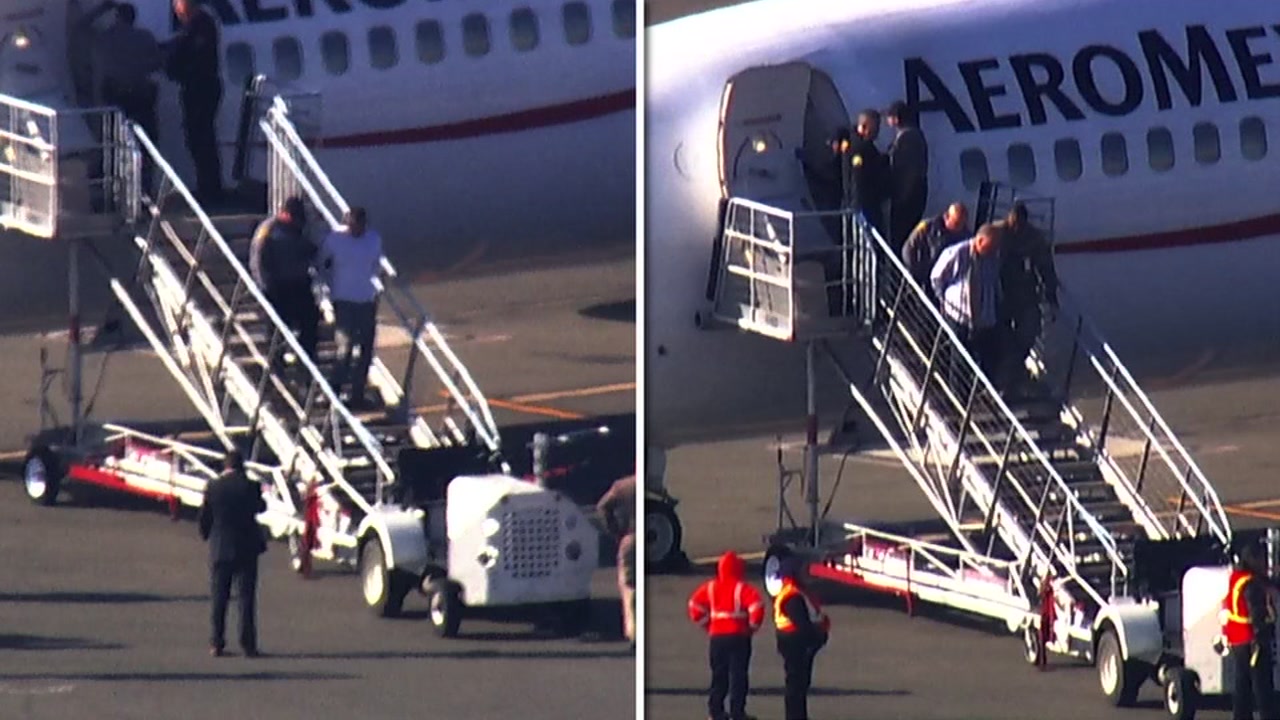 SKY7 was overhead and spotted one person being escorted from the plane in handcuffs.